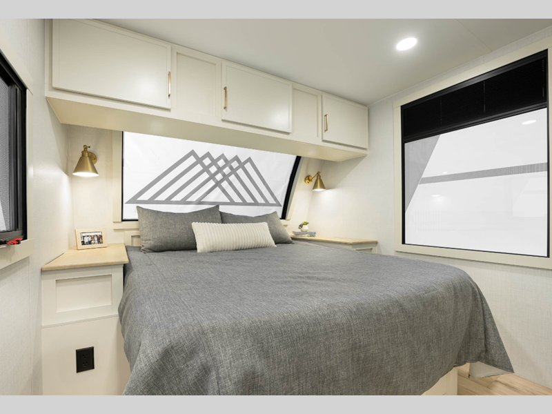 There is a seamless laminated aluminum exterior with automotive-grade full body paint and modern graphics that are sure to turn heads as you travel to the campground. You will love Brinkley's signature CraftSense wood trim, solid surface countertops, dovetail drawers, and more residential features. The picture perfect front window is a feature you are sure to love, and there is an insulated blackout privacy shade as well for added convenience.