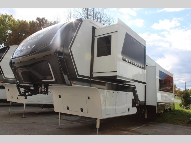 The Brinkley mid-profile Model Z fifth wheels bring you clean lines and an upscale look with plenty of style and exciting new features like the industry first brass plumbing connections. These units also feature an automotive grade front cap, plenty of exterior storage, dual exterior hot and cold showers, and wide stance leveling jacks for easy set up. Residential frameless windows provide a clean look and beautiful views, and ample electrical outlets and 6 USB/USB-C outlets allow all of your electronics and appliances to easily be used and charged.