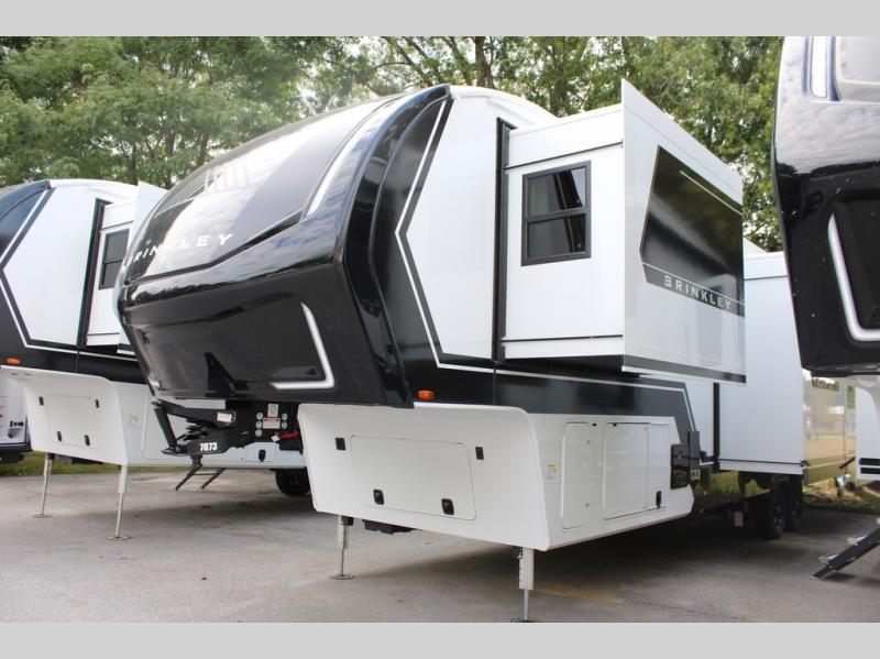 The Brinkley mid-profile Model Z fifth wheels bring you clean lines and an upscale look with plenty of style and exciting new features like the industry first brass plumbing connections. These units also feature an automotive grade front cap, plenty of exterior storage, dual exterior hot and cold showers, and wide stance leveling jacks for easy set up. Residential frameless windows provide a clean look and beautiful views, and ample electrical outlets and 6 USB/USB-C outlets allow all of your electronics and appliances to easily be used and charged.