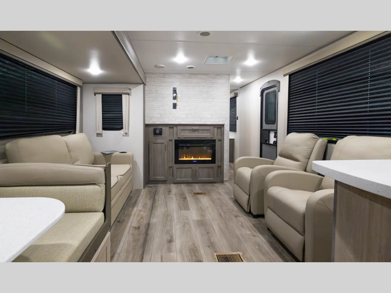 Sleeps 5 Slides 1 Length 33 ft 2 in Ext Width 8 ft Ext Height 11 ft 1 in Int Height 6 ft 9 in Hitch Weight 962 lbs GVWR 8736 lbs Dry Weight 7236 lbs Cargo Capacity 1500 lbs Fresh Water Capacity 38 gals Grey Water Capacity 74 gals Black Water Capacity 28 gals Furnace BTU 30000 btu Available Beds Queen Refrigerator Type GE Stainless 12V Refrigerator Size 10.7 cu ft Cooktop Burners 3 Shower Size 36" x 30" Number of Awnings 1 LP Tank Capacity 20 lbs Water Heater Type Tankless On Demand AC BTU 13500 btu Awning Info 21' Electric w/Multicolor LED Strip & Remote Axle Count 2 Number of LP Tanks 2 Shower Type Standard Electrical Service 30 amp Similar Floorplans