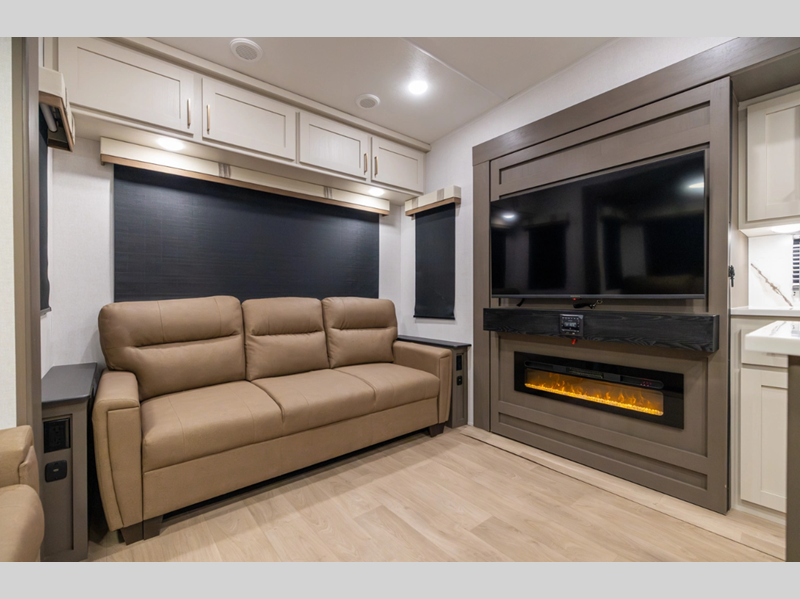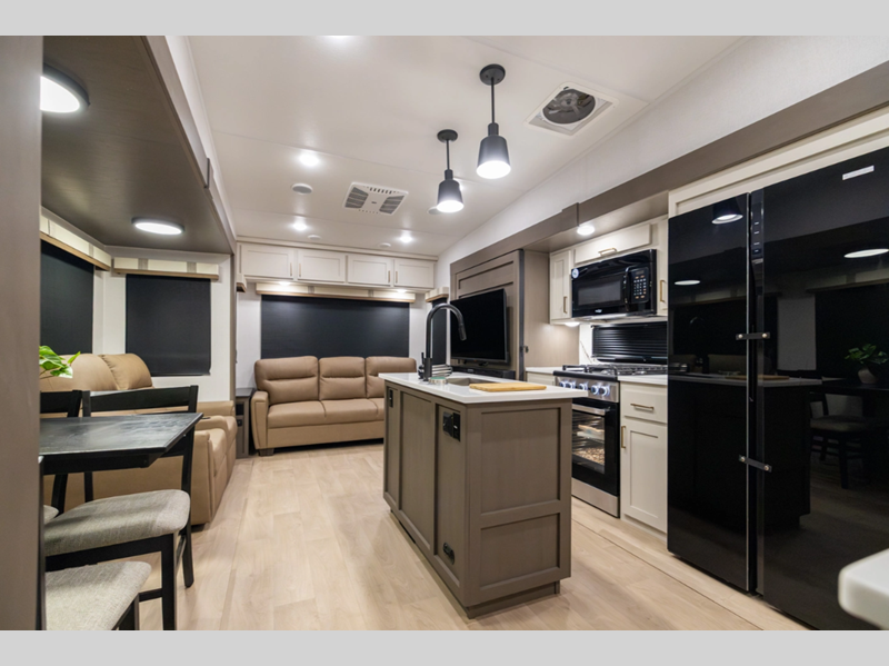 Sleeps 4 Slides 3 Length 35 ft Ext Width 8 ft Ext Height 13 ft 4 in Hitch Weight 2180 lbs Dry Weight 10864 lbs Cargo Capacity 3316 lbs Fresh Water Capacity 64 gals Grey Water Capacity 88 gals Black Water Capacity 44 gals Furnace BTU 35000 btu Available Beds King Refrigerator Type 12V Refrigerator Size 16 cu ft Cooktop Burners 4 Number of Awnings 2 LP Tank Capacity 30 lbs Water Heater Type On Demand Tankless AC BTU 27000 btu TV Info LR 50" TV Awning Info 10' 6" and 16' Power w/LED Lights Axle Count 2 Washer/Dryer Available Yes Number of LP Tanks 2 Shower Type Standard Electrical Service 50 amp Solar Wattage 200 watts Similar Floorplans