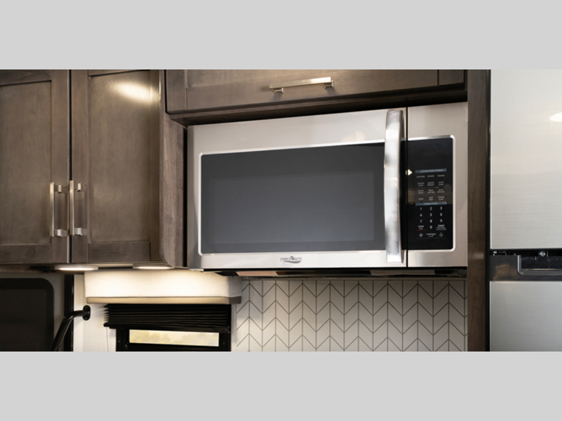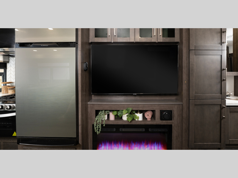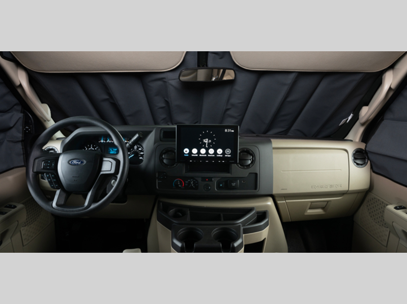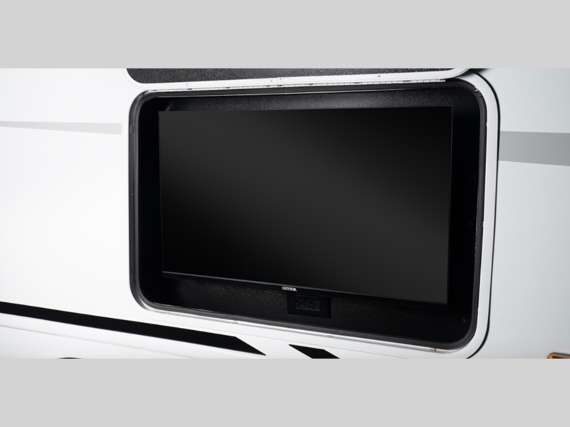 - E-Z Drive™; Automotive-bonded panoramic window in front cap with power shade; Frameless windows; Heated holding tanks (12V pads); Electric patio awning with LED lights; Black tank flush; Sony® infotainment center with Apple CarPlay® and Android Auto™; Backup and side-view cameras; LED HD Smart TV in living area