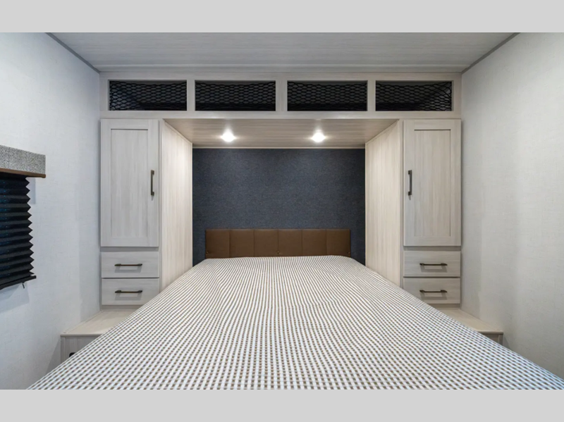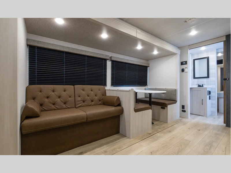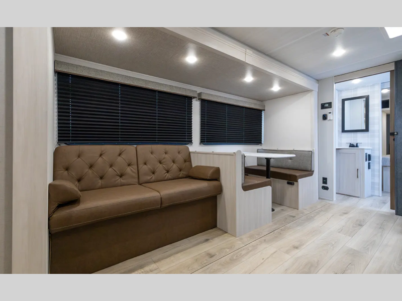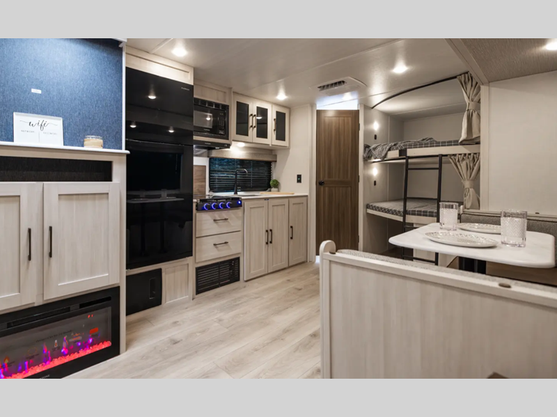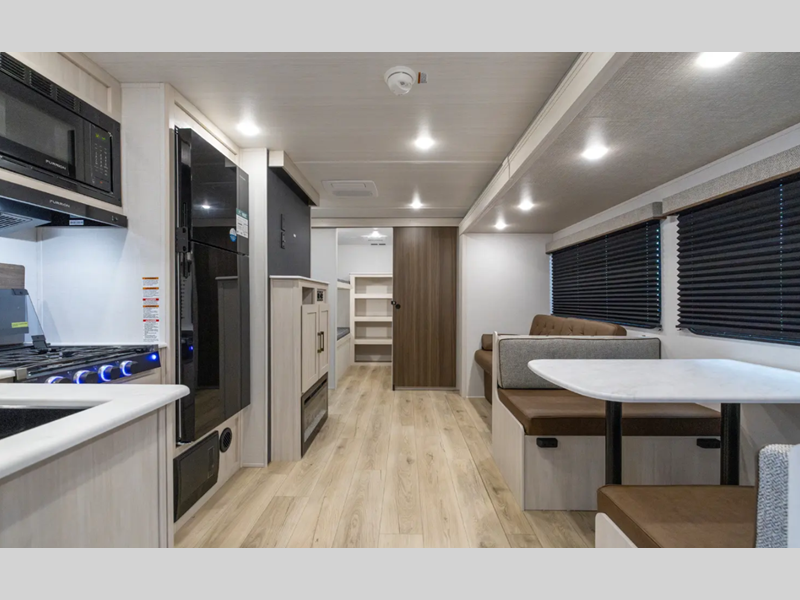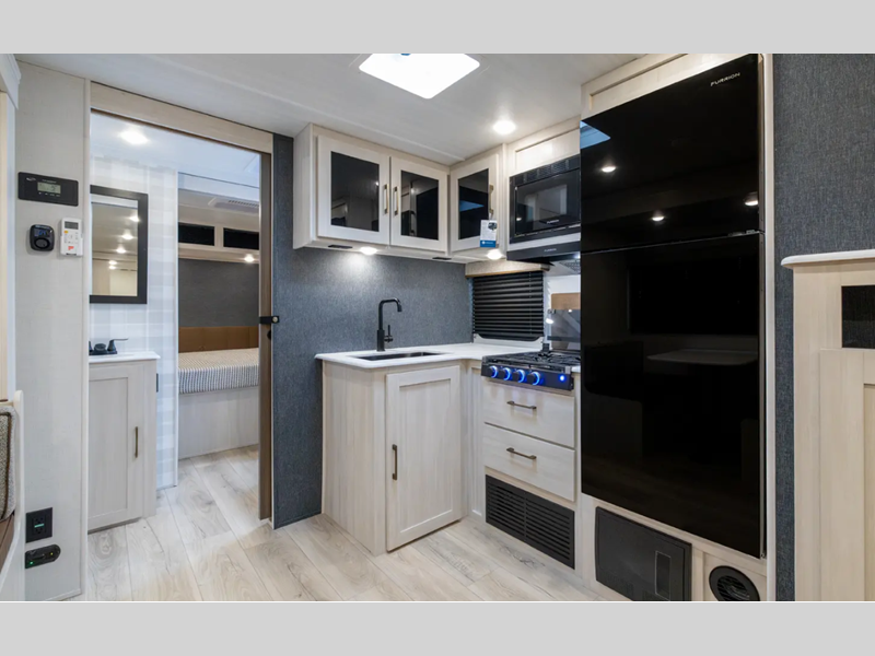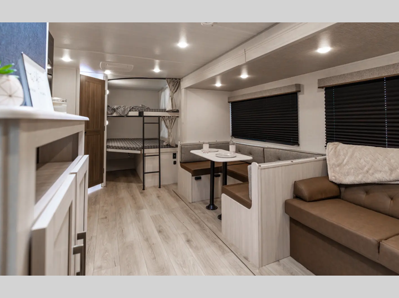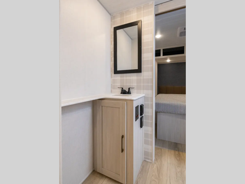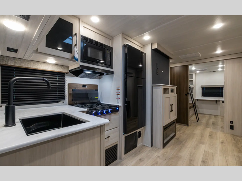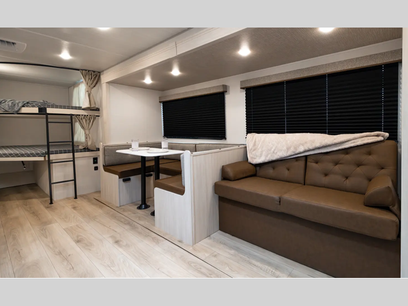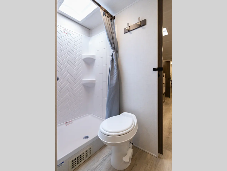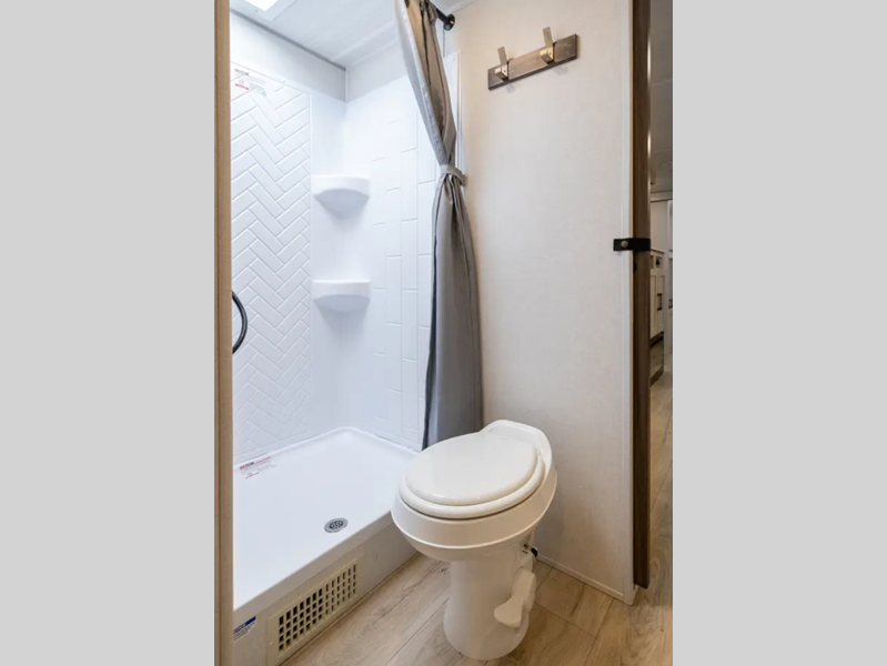 These travel trailers are extended season ready with a 2" aluminum framed floor and block foam insulation, plus there is a sealed underbelly with forced heat and radiant foil insulation. You'll love the Surf(X) seamless countertops throughout, and there is a tankless water heater for endless hot showers. Outside, a power tongue jack is ultra convenient and there is a hot and cold spray port to wash off hiking gear!