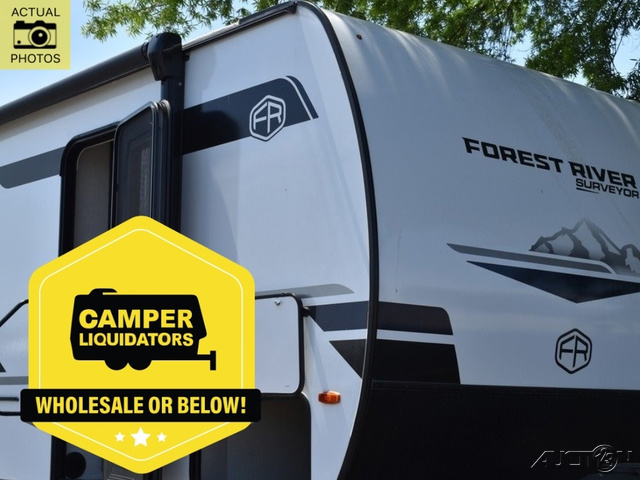 Value and versatility go hand-in-hand with the Surveyor Legend X travel trailers by Forest River. The solid construction includes a 2" aluminum framed floor with block foam insulation and a sealed underbelly with forced heat and radiant foil insulation. A 100-watt roof mounted solar panel will provide some off-grid power, and the power tongue jack will let you easily hitch up and go whenever you're ready. Additional stand-out features include Surf(X) seamless countertops throughout, two A/C units, an electric awning with LED light strip, black glass friction hinge entry door(s), and so much more!