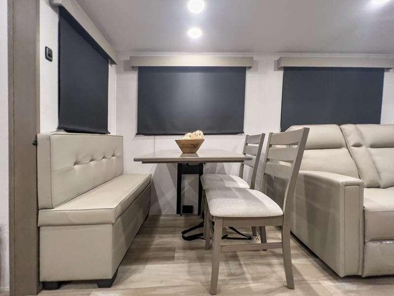 Each fifth wheel has 90-degre turning radius capabilities which allows you to be comfortable driving in town and parking into your campsite. Some construction and Arctic 4-Seasons Protection package features include a one-piece TPO roof membrane, a heated and enclosed underbelly with circulating heat, 12V heat pads on the holding tanks, and a heated pass-through storage area so you can travel and enjoy any climate. The interior offers large panoramic slide room windows for great views, premium Congoleum flooring for durability, and an On Demand water heater.