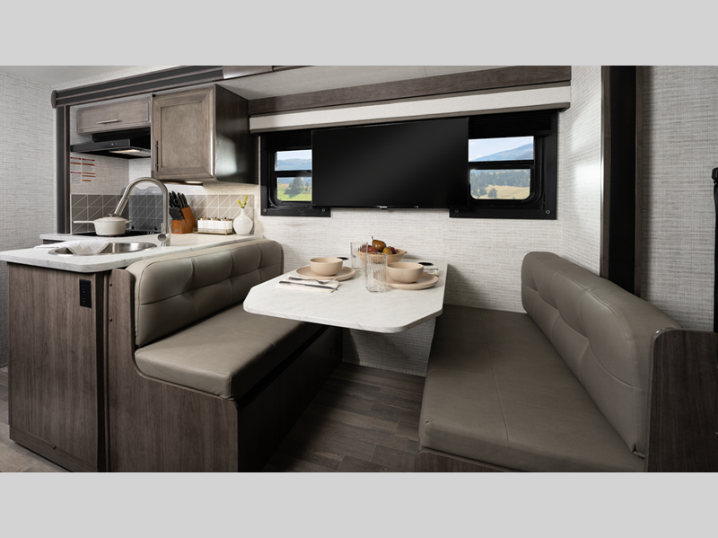 The one-piece, seamless, crowned fiberglass roof is ultra durable, and you'll find plenty of storage space for your gear in the lockable pass-through storage area. And since this coach is under 30' long, you can easily get in and out of campgrounds. Inside, the king bed is sure to bring comfort, and the USB ports in the nightstands will let you charge your phone overnight. A fully equipped kitchen also comes standard, along with a full bath, comfortable seating space, and even an optional drop-down overhead bunk if you need additional sleeping space.