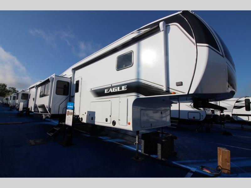 With any Eagle fifth wheel by Jayco you will appreciate durable construction materials, like the Magnum Truss Roof and the Stronghold VBL laminated walls. The JAYCOMMAND Smart RV system puts you in control of your RV's functions, and the 5 Star Handling Package will provide smooth towing from home to camp. Each model features Climate Shield zero-degree tested weather protection and the industry-exclusive HELIX cooling system that features two 15,000 BTU Whisper Quiet A/C's to keep you comfortable year around. Some of the exterior conveniences you are sure to love are the pass-through storage with Slam-Latch baggage doors and an automotive style front cap with max turn radius. The Eagle fifth wheels are designed to make you feel at home with solid hardwood slide fascia, residential vinyl flooring throughout, 100% no floor vents, and blackout roller shades with reflective side throughout for added privacy and insulation.