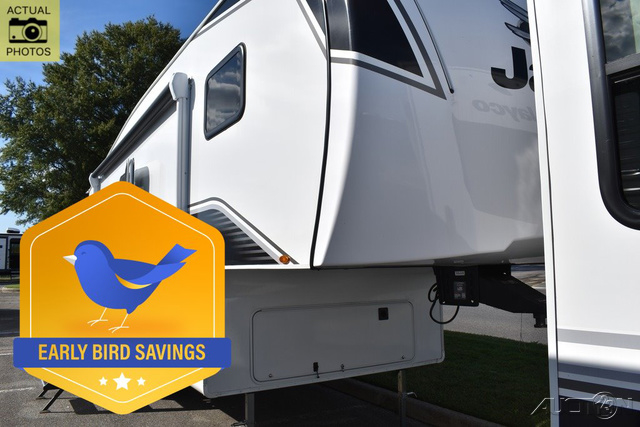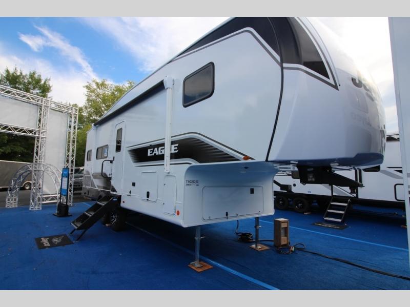 With any Eagle SLE fifth wheel by Jayco, you will enjoy a lighter tow weight, high-end finishes, and the same quality construction you've come to expect from Jayco! There is an Alpha Ply TPO roof membrane, a fully enclosed and heated underbelly, plus Stronghold VBL walls for added durability. There is also a rear 2" towing receiver outside, along with metal slam latch baggage doors, MORryde Step Above entry steps, and a Winegard Air 360 antenna with router prep if you want to stay connected as you camp. Once inside you'll enjoy the handcrafted and glazed door/drawer fronts, blackout pleated shades throughout, and residential vinyl flooring throughout with no carpet for an easier clean. The on-demand water heater, 30K BTU furnace, and 15K BTU "Whisper Quiet" A/C will ensure your comfort year around, and the optional Overland 1 Solar Package can be added if you need off-grid capabilities!