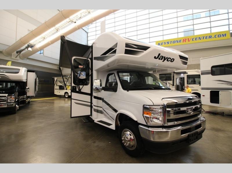 With any Greyhawk Class C gas motorhome by Jayco you will experience smooth sailing thanks to the JRIDE PLUS that comes with Koni shock absorbers, a computer-balanced driveshaft, Hellwig helper springs, and more. The Ford E-450 chassis with a 7.3L V8 325 HP engine will power your excursions, and you'll appreciate the added safety features for your peace of mind. Each model features a Sony infotainment center with Apple CarPlay and Android Auto, backup and side-view cameras, and a tire pressure monitor system the driver is sure to appreciate. Durable construction begins with Stronghold VBL roof, floor and sidewalls, bead-foam insulation, and a one-piece seamless fiberglass front cap. Head inside to find blackout night roller shades, LED-lit pressed countertops, an 84" interior ceiling height, and hardwood cabinet doors and drawers.