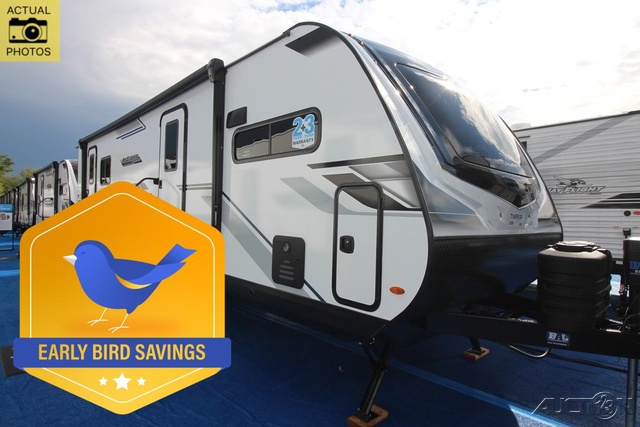 Sleeps 3 Slides 2 Length 33 ft 10 in Ext Width 8 ft Ext Height 11 ft Int Height 6 ft 6 in Interior Color Dune Gray Hitch Weight 955 lbs GVWR 8700 lbs Dry Weight 7090 lbs Cargo Capacity 1610 lbs Fresh Water Capacity 55 gals Grey Water Capacity 91.5 gals Black Water Capacity 30.5 gals Tire Size ST225/75R15E Furnace BTU 35000 btu Available Beds Queen Refrigerator Type 12V Refrigerator Size 11 cu ft Cooktop Burners 3 Number of Awnings 1 LP Tank Capacity 20 lbs. Water Heater Type On Demand Tankless AC BTU 13500 btu TV Info LED Smart TV Awning Info Max-Length Power w/LED Light Axle Count 2 Number of LP Tanks 2 Shower Type Radius Electrical Service 30 amp Solar Wattage 200 watts Similar Travel Trailer Floorplans