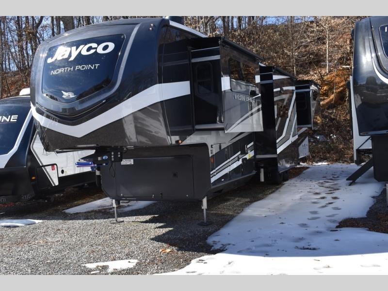 The North Point full-profile fifth wheels by Jayco boast luxurious interior details, residential features, conveniences and technology you are accustomed to having. The Luxury package alone provides a 6-point hydraulic auto-leveling system for easy and safe setup, the JAYCOMMAND "Smart RV" system allows you to monitor and control key operations on your cellphone or tablet, and an oversized multi-battery compartment which is industry leading provides room for four to six batteries.