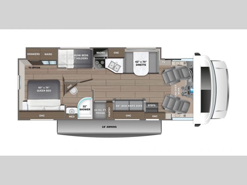 Sleeps 7 Slides 1 Length 32 ft 6 in Ext Width 8 ft 4 in Ext Height 11 ft 6 in Int Height 7 ft Interior Color Ashbrook, Modern Farmhouse Hitch Weight 7500 lbs GVWR 14500 lbs Fresh Water Capacity 47 gals Grey Water Capacity 41 gals Black Water Capacity 31 gals Tire Size LT225/75R16E Furnace BTU 30000 btu Generator 4,000W Fuel Type Gas Engine 7.3L V8 Chassis Ford E-450 Horsepower 325 hp Fuel Capacity 55 gals Wheelbase 223 in Number Of Bunks 3 Available Beds RV Queen Torque 450 ft-lb Refrigerator Type 12 Refrigerator Size 10 cu ft Cooktop Burners 3 Shower Size 32" Number of Awnings 1 LP Tank Capacity 41 lbs Water Heater Capacity 6 gal Water Heater Type Gas/Electric DSI AC BTU 15000 btu Basement Storage 50 cu. ft. TV Info LR LED HD Smart TV Awning Info 18' Electric with LED Lights Gross Combined Weight 22000 lbs Shower Type Radius Electrical Service 30 amp Similar Motor Home Class C Floorplans