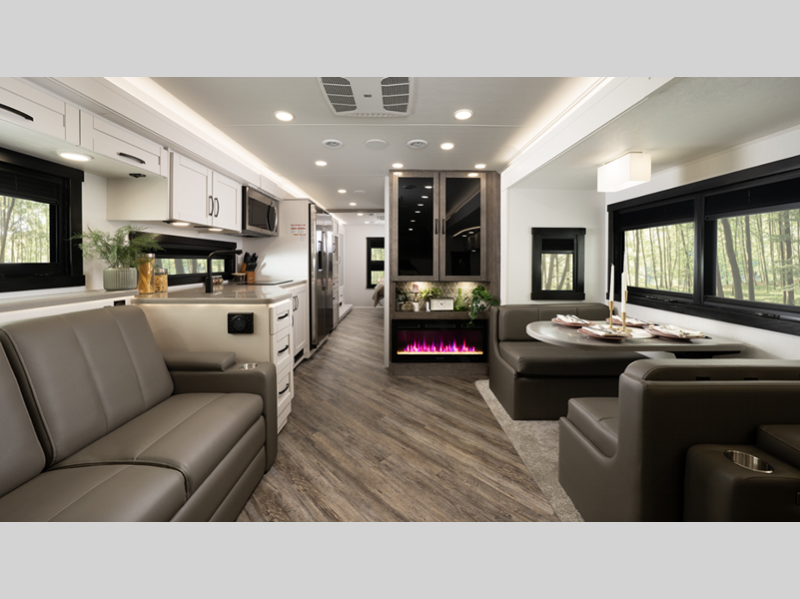 Sleeps 6 Slides 3 Length 39 ft 4 in Ext Width 8 ft 5 in Ext Height 13 ft 4 in Int Height 7 ft Interior Color Brookside, Modern Farmhouse Exterior Color Full-Body Paint; Ashland, Carthage, Clarington, Perry, Midnight Hitch Weight 12000 lbs GVWR 31000 lbs Fresh Water Capacity 72 gals Grey Water Capacity 50 gals Black Water Capacity 50 gals Tire Size 275/80R 22.5 Furnace BTU 30000 btu Generator Onan 8,000 Watt Quiet Diesel Fuel Type Diesel Engine Cummins ISB 6.7L Chassis Freightliner S2RV Plus Horsepower 360 hp Fuel Capacity 100 gals Wheelbase 279 in Number Of Bunks 1 Available Beds King Torque 800 ft-lb Refrigerator Type Residential Convection Cooking Yes Cooktop Burners 3 Shower Size 30" x 36" Number of Awnings 1 LP Tank Capacity 83 lbs Water Heater Type Tankless AC BTU 30000 btu Basement Storage 157 cu. ft. TV Info LR 50" LED TV, BR LED HD Smart TV, Ext. LED TV Awning Info 23' Electric with LED Lights Washer/Dryer Available Yes Gross Combined Weight 43000 lbs Shower Type Standard Electrical Service 50 amp Solar Wattage 200 watts Similar Floorplans
