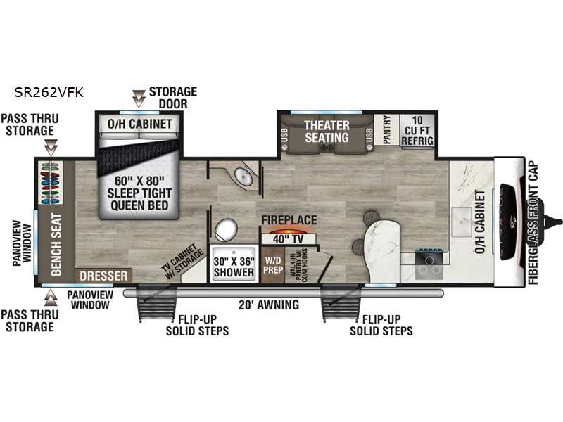 Sleeps 8 Slides 1 Length 26 ft 3 in Ext Width 8 ft Ext Height 10 ft 10 in Int Height 6 ft 6 in Interior Color Chestnut, Fawn, Sufside Maple, Teak Exterior Color Arctic White (Standard), Aztec Grey Hitch Weight 570 lbs GVWR 7315 lbs Dry Weight 5420 lbs Cargo Capacity 1895 lbs Fresh Water Capacity 45 gals Grey Water Capacity 64 gals Black Water Capacity 32 gals Tire Size 15" Furnace BTU 30000 btu Number Of Bunks 2 Available Beds Queen Refrigerator Type 12V Refrigerator Size 10 cu ft Cooktop Burners 3 Shower Size 30" x 36" Number of Awnings 1 Axle Weight 4850 lbs LP Tank Capacity 20 lbs Water Heater Type Tankless Cargo Deck Size 0 ft TV Info LR 40" Smart TV Awning Info 18' Axle Count 2 Number of LP Tanks 2 Shower Type Standard Similar Floorplans