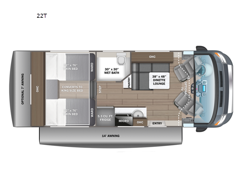 | Wheelbase | 156 in | Available Beds | Twin Bed with King Conversion |