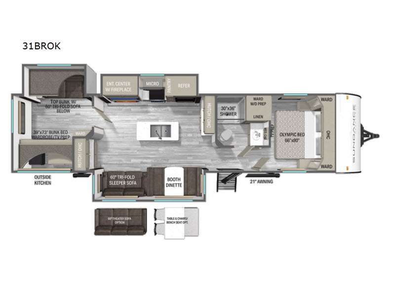 At the front of this travel trailer, the private bedroom offers a comfortable retreat with a 66" x 80" Olympic bed, flanked by wardrobes on each side, plus overhead cabinets and an additional corner wardrobe perfect for storing clothes and camping gear. Just down the hall, the bathroom features a 30" x 36" shower, a medicine cabinet with a custom-framed mirror, and a linen cabinet to keep towels easily accessible. The spacious main living area is made even more open by dual opposing slides. One slide includes the entertainment center, a three-burner range, pantry, and a 10-cu. ft. refrigerator for all your cooking and storage needs, while the central kitchen island equipped with a sink and pull-out sprayer adds functionality and convenience. Opposite that, the second slide features a 60" tri-fold sleeper sofa and booth dinette, offering ample seating and additional sleeping space. At the rear, the dedicated bunkhouse includes a 39" x 73" bunk, a top bunk on the opposite side, and a 60" tri-fold sofa below ensuring everyone has a cozy place to rest after a day full of adventure.