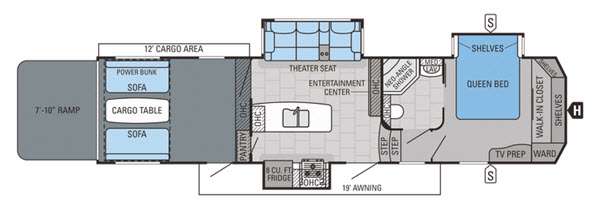 As you enter the Seismic Wave 352W toy hauler travel trailer by Jayco, to the left you will find a slide with a three burner range and a refrigerator. Next to the slide there is a pantry, lots of counter space and a double kitchen sink. On the opposite side of the fifth wheel you will find a slide with theater seats. Next to the slide you are sure to enjoy watching TV or movies at the entertainment center.