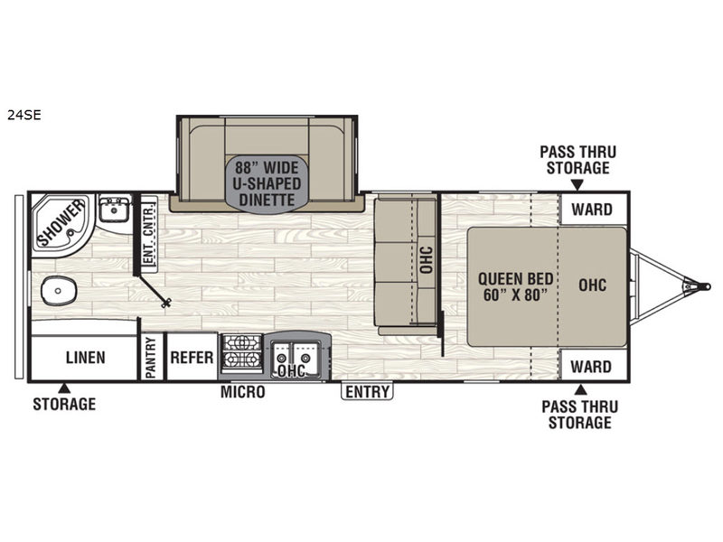 You will also enjoy exterior storage found outside beneath the linen storage in the bathroom, and also in front with a complete exterior pass-through storage compartment accessible on both sides, along with so much more!