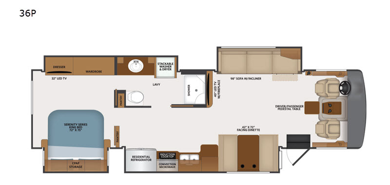 Four slides, sleeping space for five people, and plenty of at-home comforts are what you will enjoy throughout this Southwind Class A gas motorhome by Fleetwood RV. Come visit with your family in the front living area and be entertained with a 40" LED TV, or head out under the 15' power awning where you will find an exterior 40" TV for your viewing pleasure when outdoors. Seating space can be found on the sofa or 42" x 72" dinette, and at night, these can both transform into sleeping spaces. You can also increase this unit's sleeping space by adding the optional drop-down queen bunk with 24" LED TV above the cab. Between the driver and passenger seats there is a pedestal table where you can play a board game or enjoy another cup of coffee. When it's time to catch a few winks of sleep, head to the rear master suite where you will find a comfortable RV king bed, as well as a wardrobe and dresser!